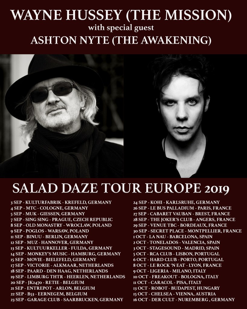 Nyte first performed with Hussey in South Africa in 2015 and then supported The Mission for 17 shows across Europe in 2016 with his gothic rock act The Awakening. The Salad Daze Tour will see both artists performing solo in a more intimate setting. “It will be absolutely wonderful touring with Wayne again! The Mission were a significant influence on the genesis of The Awakening and Wayne has remained an inspiration in my artistic life. I am also blessed to call him a friend” says Ashton Nyte.