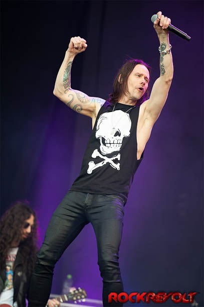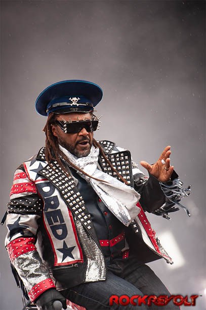 Skindred have secured a Main stage appearance this year at Download following many previous appearances. Despite the pouring rain, front man Benji Webbe manages to get the crowd singing, crouching, and generally jumping about. Skindred whose album Big Tings was released last year continue, with a string of dates after Download that include Hellfest in France. During the set Reef’s Gary Stringer joins Benji onstage for the track “Machine” Benji is looking like a lean mean rocking machine after his recent well publicized weight loss, and he makes light of the inclement weather while the crowd are lapping it up. The band’s trademark crowd participation “the Newport helicopter” is rolled out during “Warning”. and fans everywhere are removing their T-shirts and swinging them wildly over their heads. This as always makes for an amazing sight. This has been another superb high energy performance from a great live band.