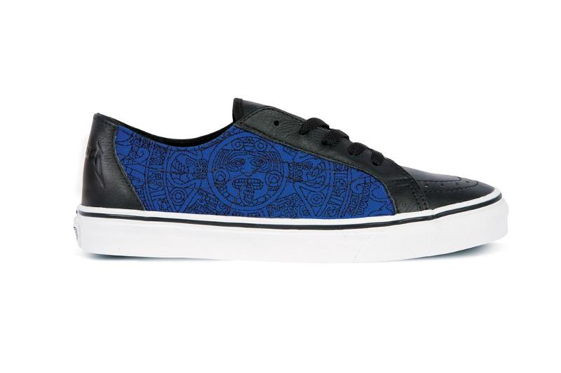 Robert Trujillo - Robert grew up wearing Vans as a young skater in Venice Beach, California. For his shoe, he took Aztec calendar artwork, designed by his wife Chloe, which is carved in one of his bass guitars and placed it in blue, on the side of this Escuela.