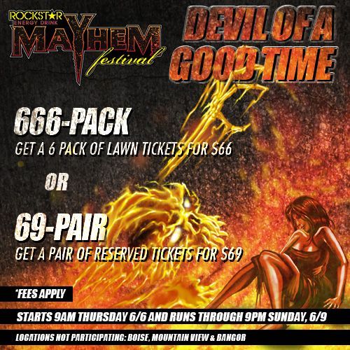 Act now and save some money on your cherished ROCKSTAR ENERGY DRINK MAYHEM FESTIVAL tickets. You and several friends can enjoy the festival together for a very low price with the ROCKSTAR ENERGY DRINK MAYHEM FESTIVAL “Devil of A Good Time” offer. This offer features your choice of paying JUST $66 for a 6-pack of lawn tickets, or $69 for a pair of tickets in the reserved section (plus fees)! NOT PARTICIPATING: Boise, ID / Mountain View, CA / Bangor, ME / Boston, MA.