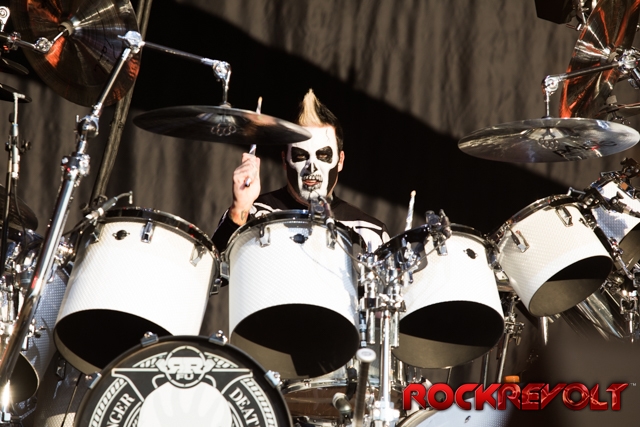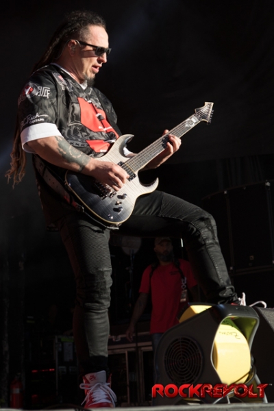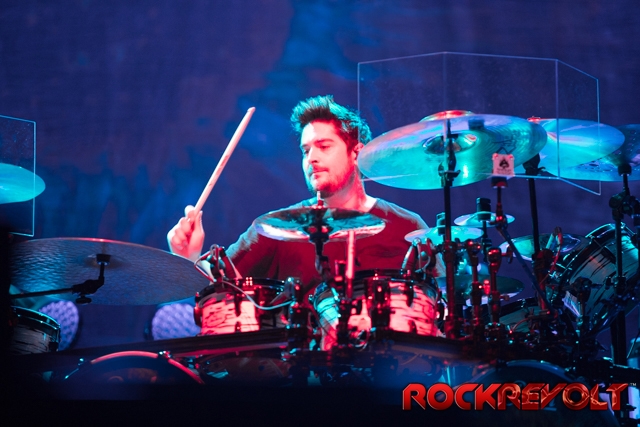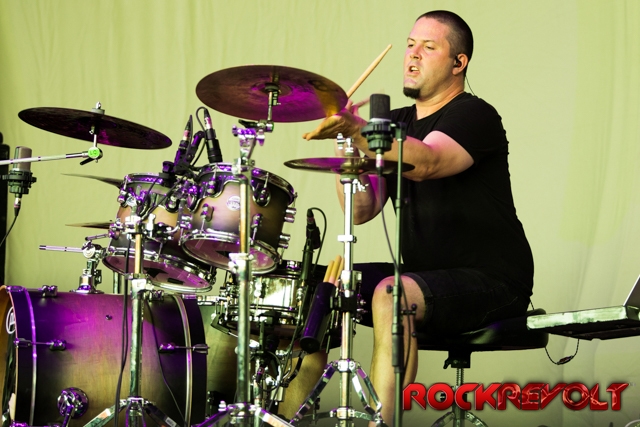 The last band to take the stage on this co-headlining adventure was Breaking Benjamin. In stark contrast to the bright sunshine and pyrotechnics, Breaking Benjamin opted for a darker, simple stage. With the sun now securely nestled below the horizon, they opened with “Red Cold River” from their most recent release Ember. They brought down the house on the second song with “I Will Not Bow”. Five songs into the set, a strange drum/lightsaber love-child was brought front and center. With Benjamin Burnley pounding the drums up front, the band performed a medley of the Star Wars Imperial march, Tool’s “Schism”, Nirvana’s “Smells Like Teen Spirit”, Pantera’s “Walk”, and Metallica’s “Sad But True”. Because nothing says “heavy” like Sad But True.