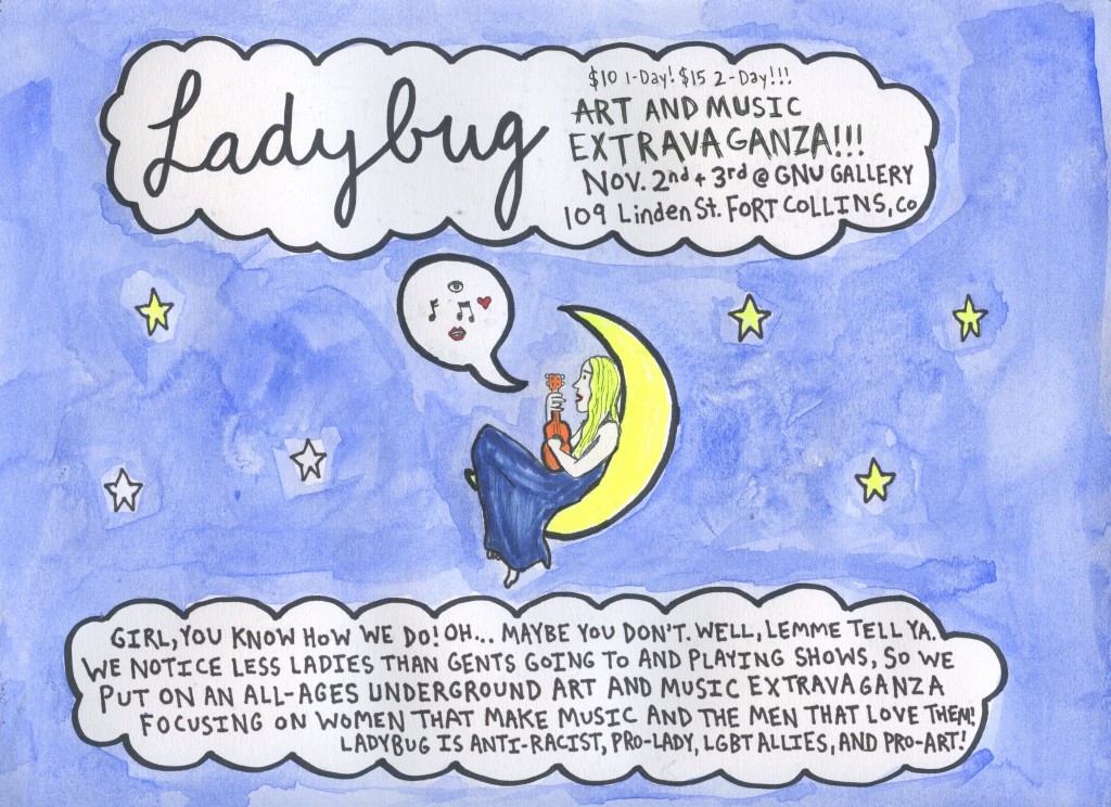 Sara: Well, I didn’t create Titwrench. While I do volunteer at it and play it, I have very little to do with choosing the line-up or really running the fest. It’s different because it’s different people. Ladybug is my first festival that I’ve arranged. Also, Ladybug was proposed to me by G.N.U. Gallery as something I might like to do, so I took them up on it, but it wasn’t particularly my idea. There are many woman-centric festivals in this general region, including Albuquerque’s Gatas y Vatas,Tempe’s Fox-Vag Fest, Denver’s Titwrench, and now, Ladybug in Fort Collins. The ladies involved in one are often involved in all, and I’ve played all of these festivals at one time or another. Ladybug is also only happening once, while the others are annual. If people really want a woman-centric festival in Colorado, then they already have Titwrench. I’m doing this for people that might not know about Titwrench, who might not know what’s happening sixty miles away. Finally, the festival focuses on Colorado-based acts, while all the other festivals tend to rely greatly on touring acts. The aim of something like this is to equal out gender ratios at shows, it has nothing to do with either alienating men. To me, we’re all striving towards a world where we don’t have to be like, “Hey. Yeah. Women still play music, and it’s not a novelty. It’s been going on a while.” For a variety of reasons that typically reflect a deeply rooted mysogeny that exists in our over-all culture, women are the less represented gender in art and music. I do this because I want more women in the audience, more women onstage, more women painting, owning businesses, ruling the world, because I honestly don’t think we’ve seen enough of that.