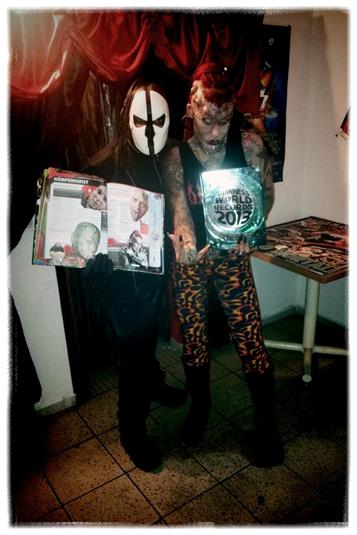 The Guinness World Record of most body modifications? She is such a cool person, yet it’s striking when you look at her. People like you and me are not that judgmental, so we don’t have a problem with it, but you know how people are, especially when they see someone that looks like an actual vampire, like she does. All of her teeth are vampire teeth. She has implants all over her head. It’s crazy. And yet she is such a loving and caring person. She’s like a big sister to me right now. She has four children. I was hanging with her and her family, because she also played at the festival I did in Mexico. So then I was sharing some booze with her and her husband, and we started discussing tattoos and stuff, and I decided to get these sigils on my arms (holds up arms).